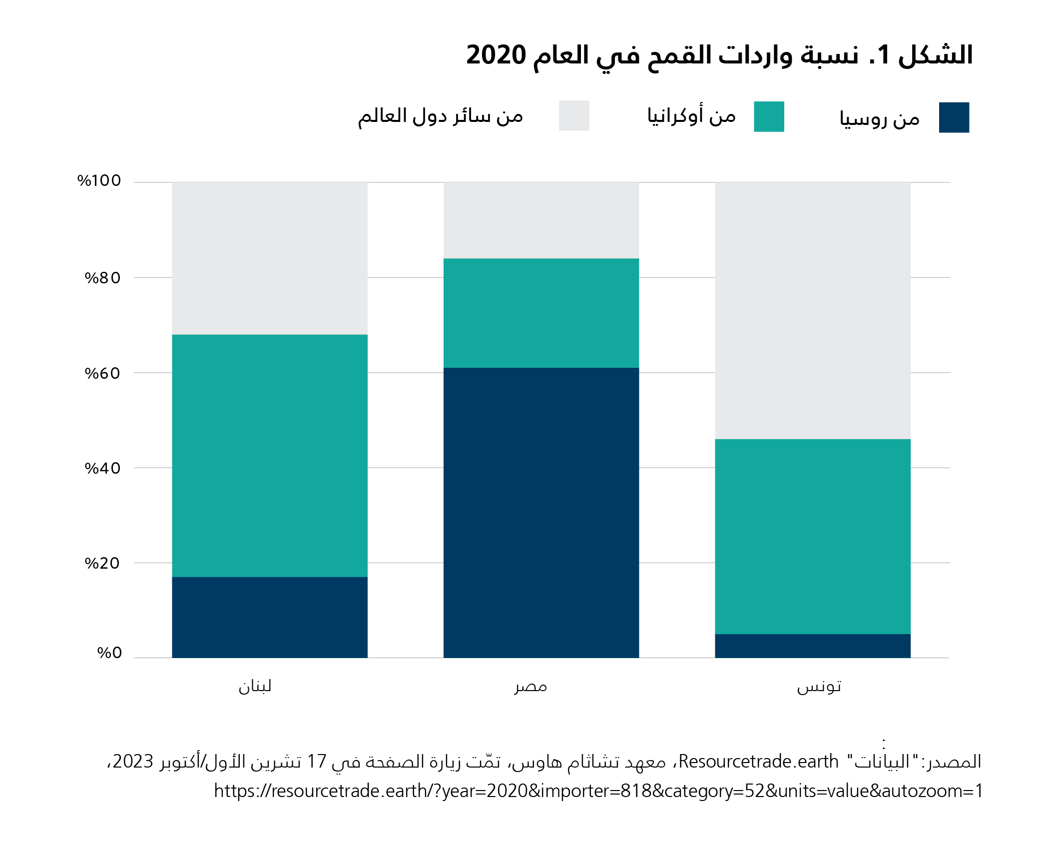 تَسبَّب الصراع في أوكرانيا إذًا باضطرابات كبيرة في تجارة الأغذية العالمية، وترك أثرًا بارزًا على الأمن الغذائي في منطقة الشرق الأوسط وشمال أفريقيا، نظرًا إلى ارتفاع مستويات الاعتماد على الواردات الغذائية في بلدان المنطقة. فهذه الأخيرة هي أكبر مستورد للحبوب في العالم، ونصف وارداتها من القمح، الذي يُعَدّ مكوّنًا أساسيًا في السلال الغذائية للبلدان العربية، كان يأتي من روسيا وأوكرانيا قبل الحرب.6 وترتفع مستويات الاعتماد على واردات القمح بوجه خاص في مصر ولبنان، إذ وصلت نسبة استيراد القمح من أوكرانيا وروسيا في العام 2020 إلى 84 في المئة و68 في المئة في البلدَين على التوالي (انظر الشكل 1 أدناه).7 نتيجةً لذلك، أصبحت البلدان منخفضة ومتوسّطة الدخل في المنطقة معرّضةً بشدّة لعواقب الحرب التي عطّلت الإمدادات الغذائية، ورفعت أسعار المواد الغذائية والأسمدة وموارد الطاقة، ما أدّى بدوره إلى زيادة فواتير الواردات، وأثّر سلبًا على الموازين التجارية لهذه البلدان وعلى صرف العملات الأجنبية فيها. فما كان من ذلك إلا أن أجهد اقتصادات منطقة الشرق الأوسط وشمال أفريقيا، التي كانت أصلًا متعثّرة اقتصاديًّا وماليًّا.
