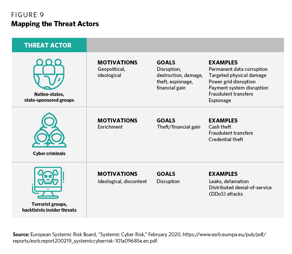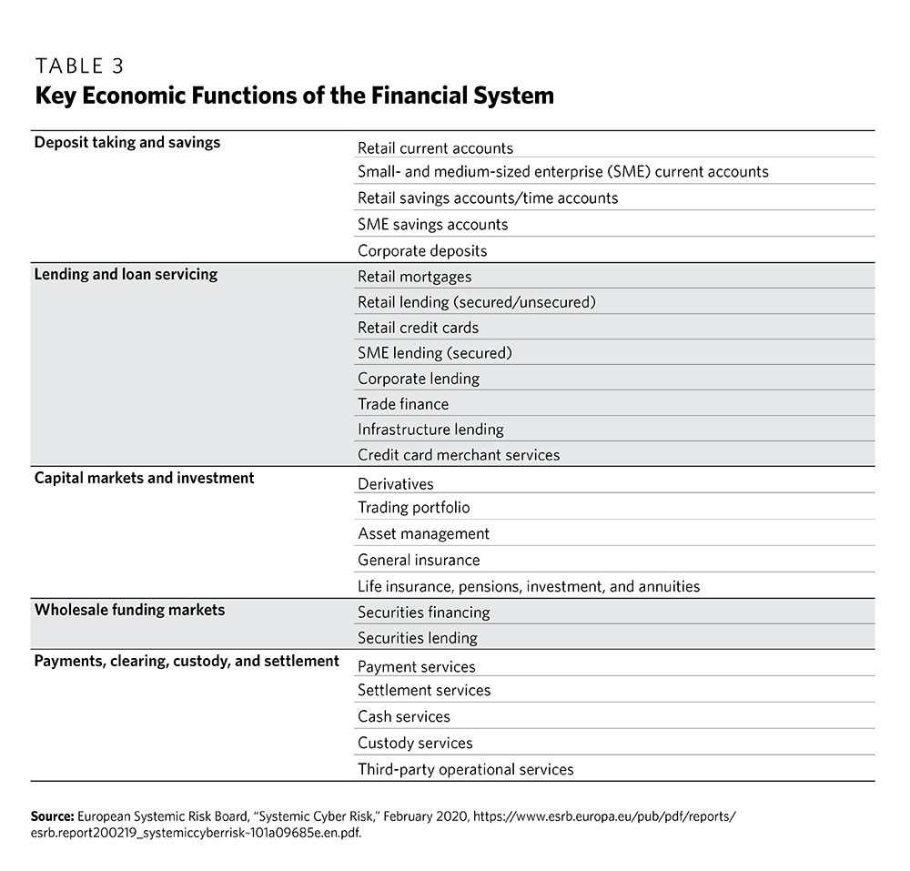 7 Tim Maurer et al., “Toward a Global Norm Against Manipulating the Integrity of Financial Data,” Carnegie Endowment for International Peace, March 2017, https://carnegieendowment.org/2017/03/27/toward-global-norm-against-manipulating-integrity-of-financial-data-pub-68403; European Systemic Risk Board, “Systemic Cyber Risk,” February 25, 2020, https://www.esrb.europa.eu/pub/pdf/reports/esrb.report200219_systemiccyberrisk~101a09685e.en.pdf; Greg Ros, “The Making of a Cyber Crash: A Conceptual Model for Systemic Risk in the Financial Sector,” European Systemic Risk Board, Occasional Paper Series No 16, May 2020, https://www.esrb.europa.eu/pub/pdf/occasional/esrb.op16~f80ad1d83a.en.pdf.