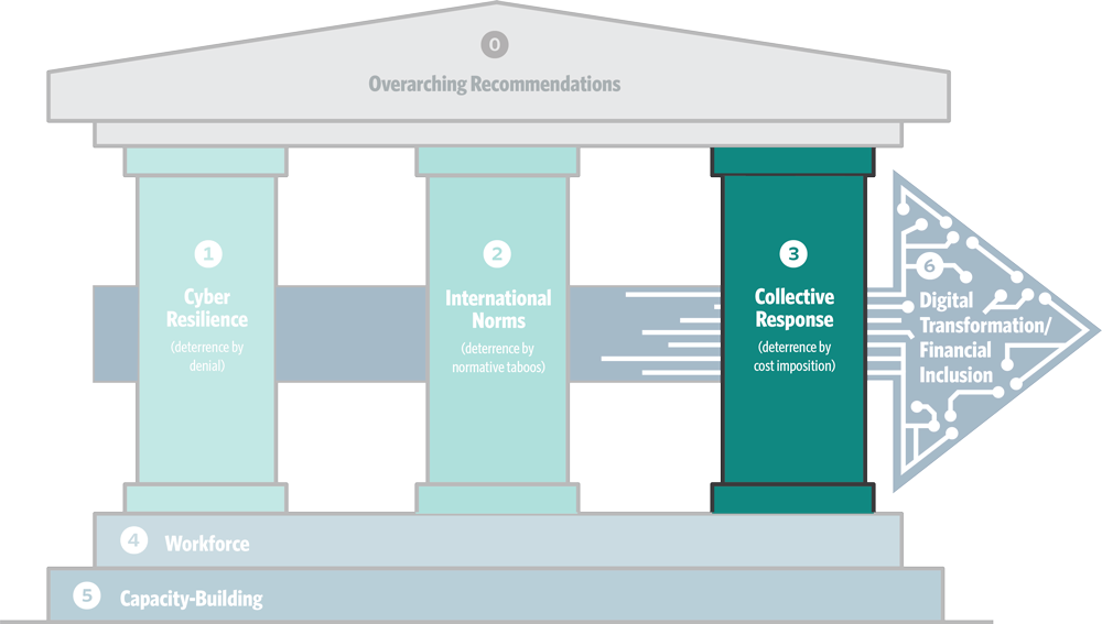 The following recommendations outline specific steps that governments and industry can take to facilitate a collective response to an incident in order to deter malicious actors from future cyber attacks. Such a response may include law enforcement action, and it may well require strengthening the financial sector’s ties to other parts of the national security community, considering the growth of state-sponsored threats.