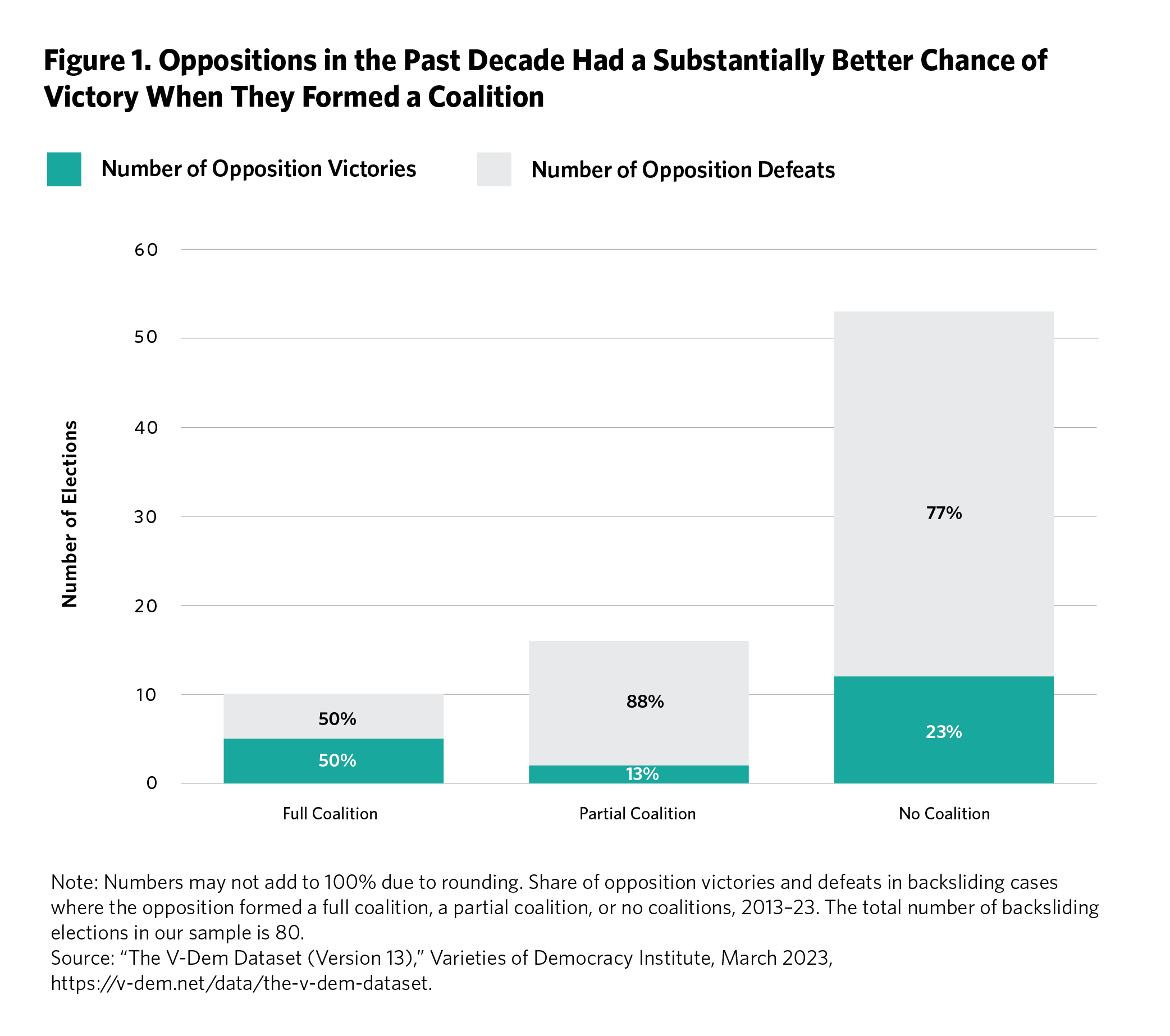 Figure 4 shows that in the past ten years, an opposition formed a full coalition in one-third of elections in countries with severe backsliding. In another third, an opposition formed a partial coalition (although as seen in Figure 1, none won). Meanwhile, among elections in countries with mild backsliding, only about one in ten oppositions formed a full coalition.