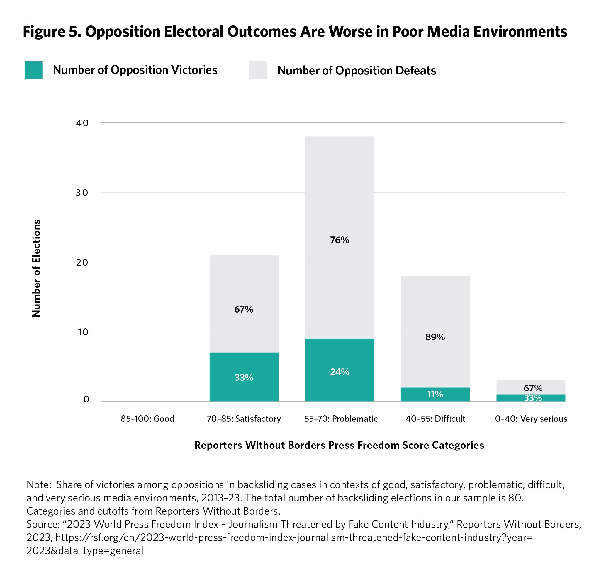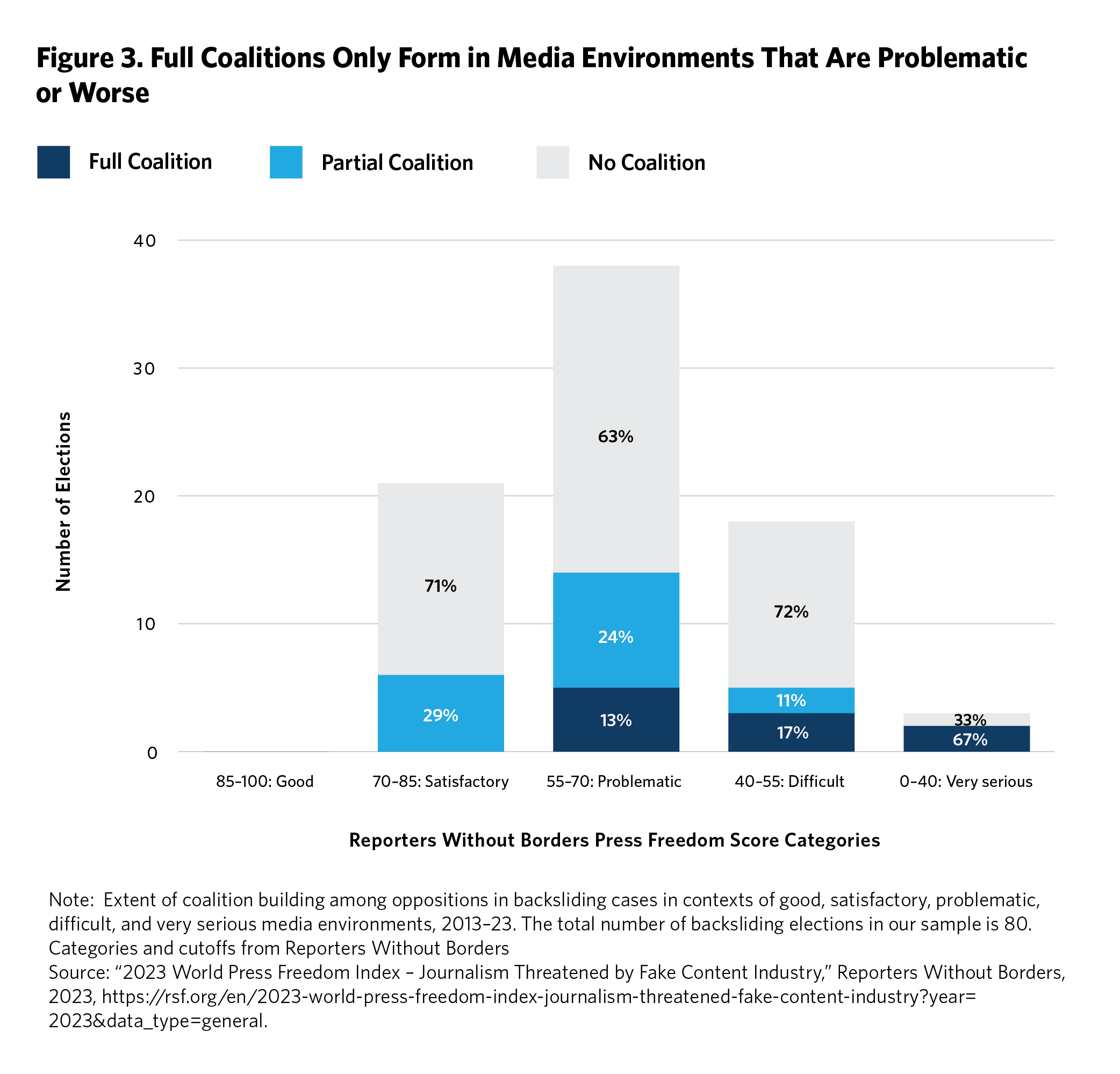 We analyzed data from the Reporters Without Borders Press Freedom Index, which uses a scale of 1 to 100 to measure not only journalist safety but also the legal, economic, and political constraints on media autonomy and independence. In the best media environments (scores of 85 to 100), we have no elections in backsliding contexts. Figure 3 shows that in satisfactory media environments, where the Press Freedom scores were between 70 and 85, not a single opposition formed a full coalition in the past ten years. But in problematic media environments, where the scores were between 55 and 70, one in seven oppositions formed a coalition. And in difficult or very serious media environments, where the scores were below 55, one in four oppositions formed a coalition.