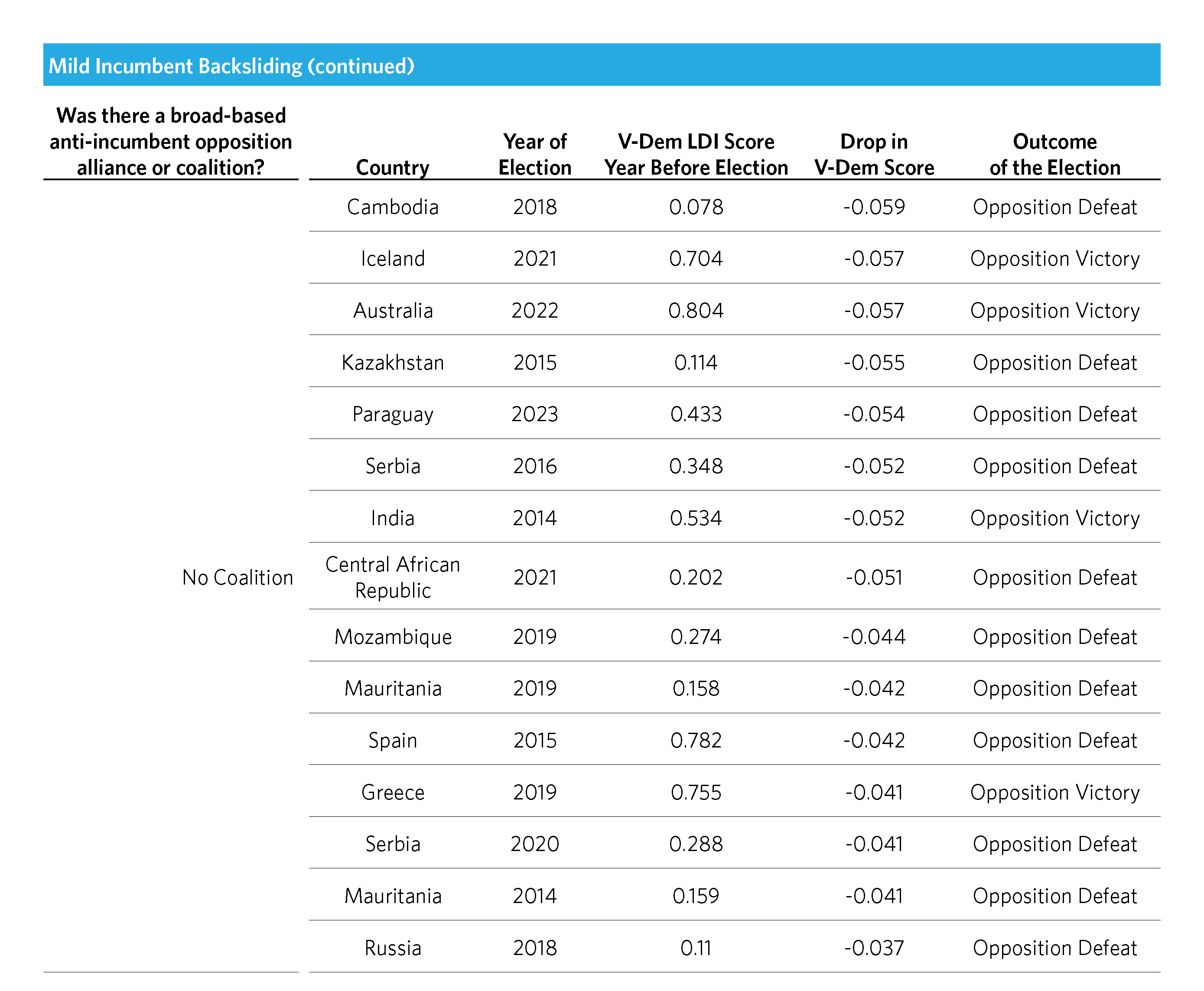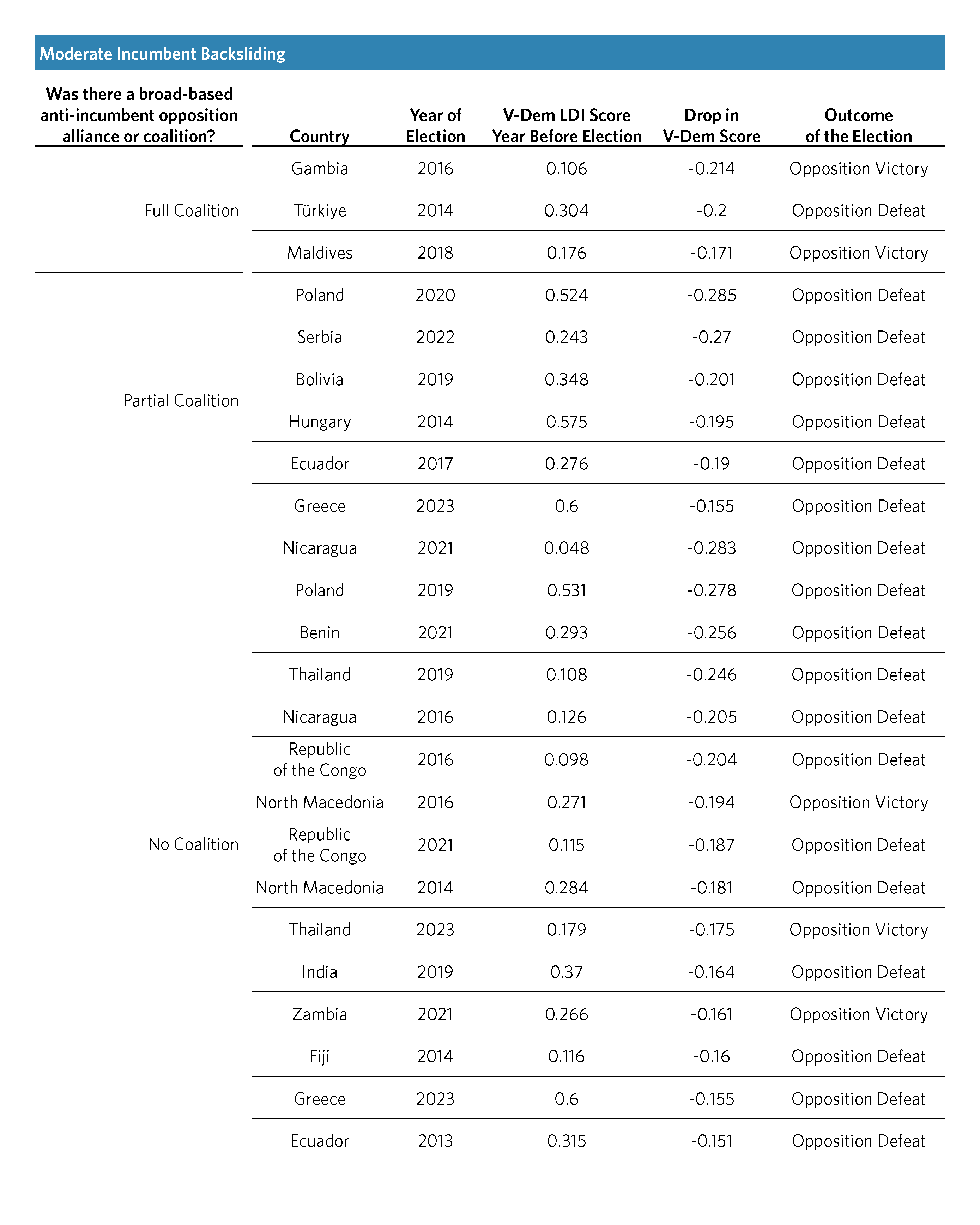 We considered a coalition strategy to be “partial” in cases where the opposition took steps to build an unusual electoral coalition for the purpose of ousting the backsliding incumbent, but it only partially succeeded. In these instances, generally the groundwork was laid for a coalition, but it did not attract a significantly broad group of partners, or multiple coalitions were formed and did not consolidate under one big tent.